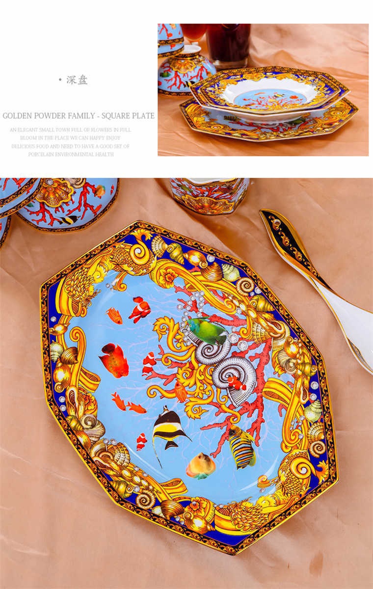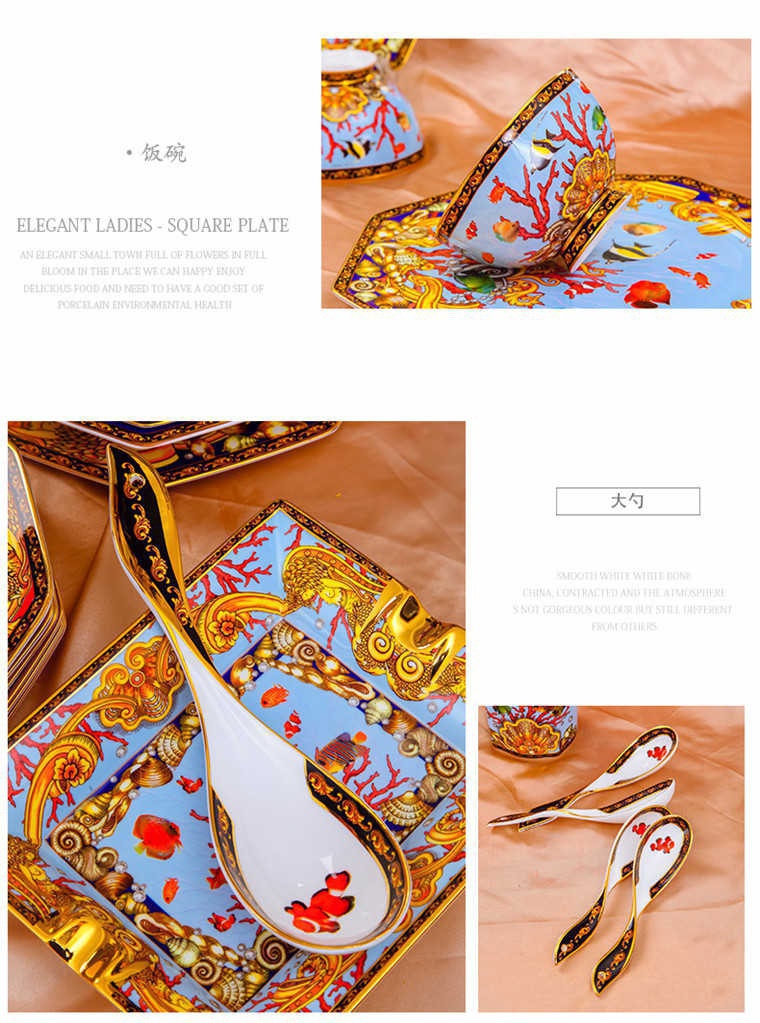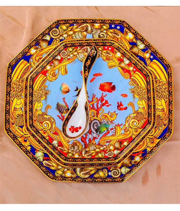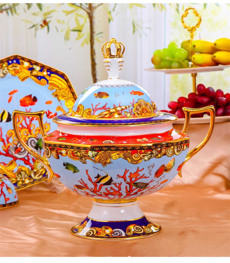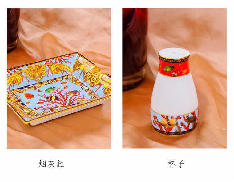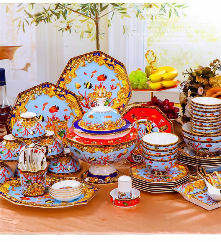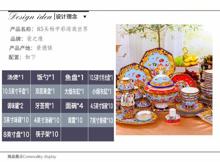 85頭釉中彩海底世界,一個(gè)湯煲,一個(gè)飯勺,一個(gè)魚(yú)盤(pán),一個(gè)10.5寸平盤(pán),一個(gè)10.5寸月光盤(pán),雙層果盤(pán)一個(gè),一個(gè)大煙缸,一個(gè)小煙缸,二個(gè)調(diào)料罐,一個(gè)牙簽筒,四個(gè)面碗,十個(gè)4.5寸飯碗,十個(gè)三寸調(diào)味碟,十個(gè)4寸湯碗,十個(gè)調(diào)羹,十個(gè)7寸骨碟,十個(gè)八寸盤(pán),十個(gè)筷子架。