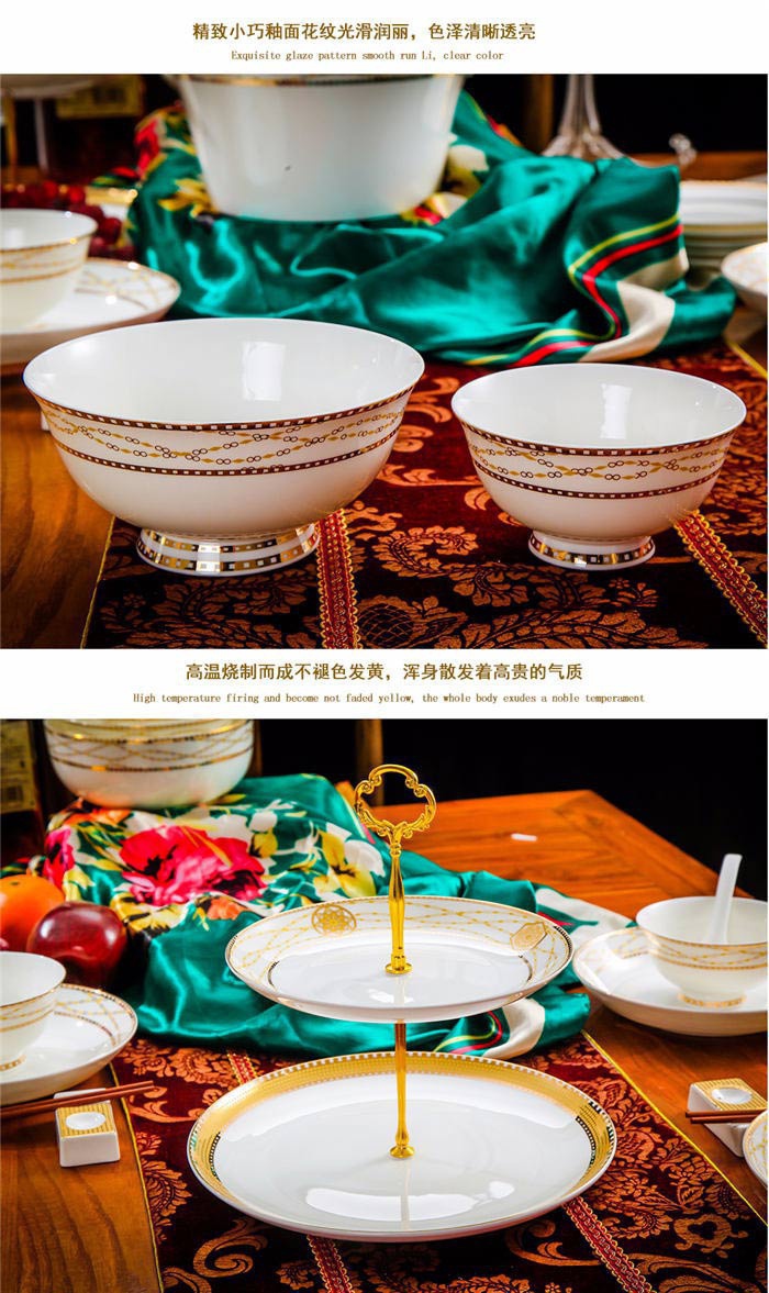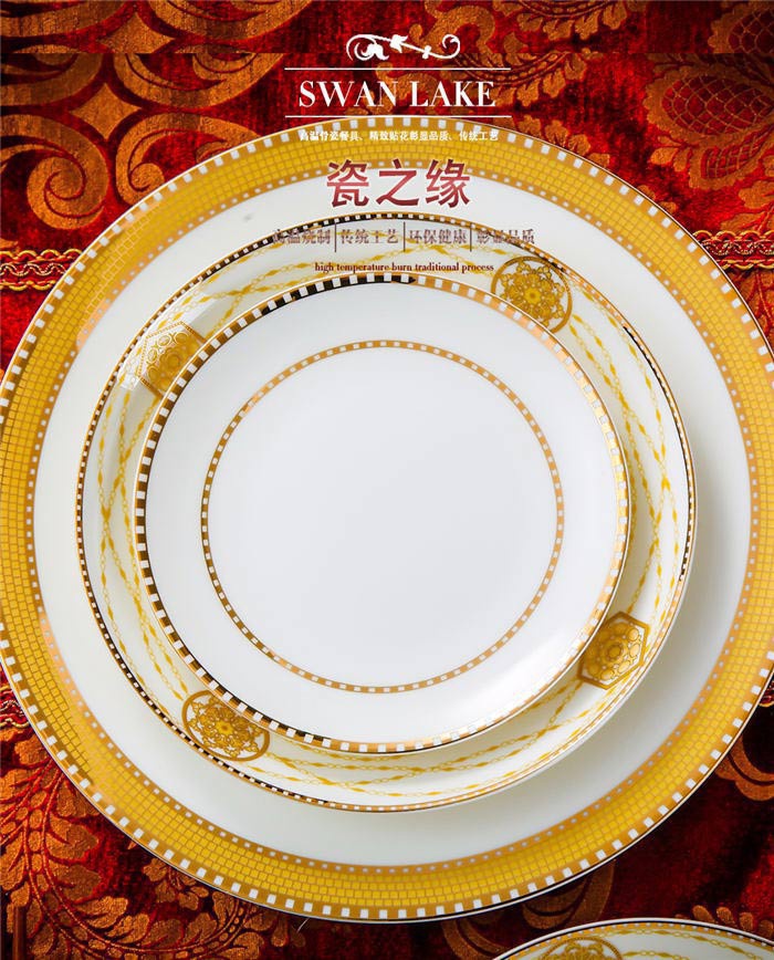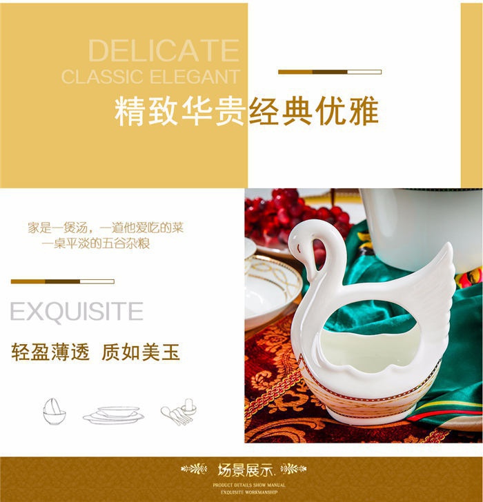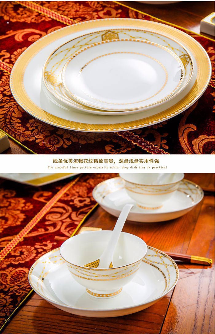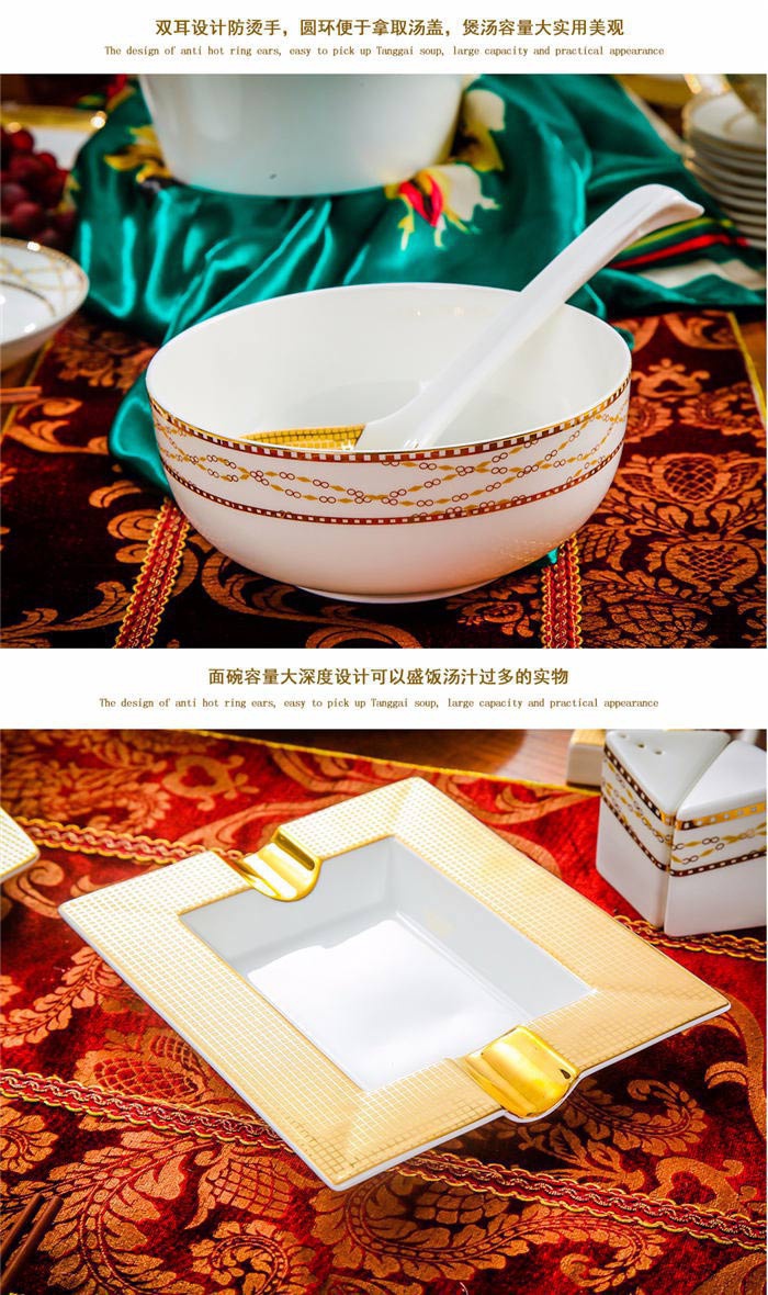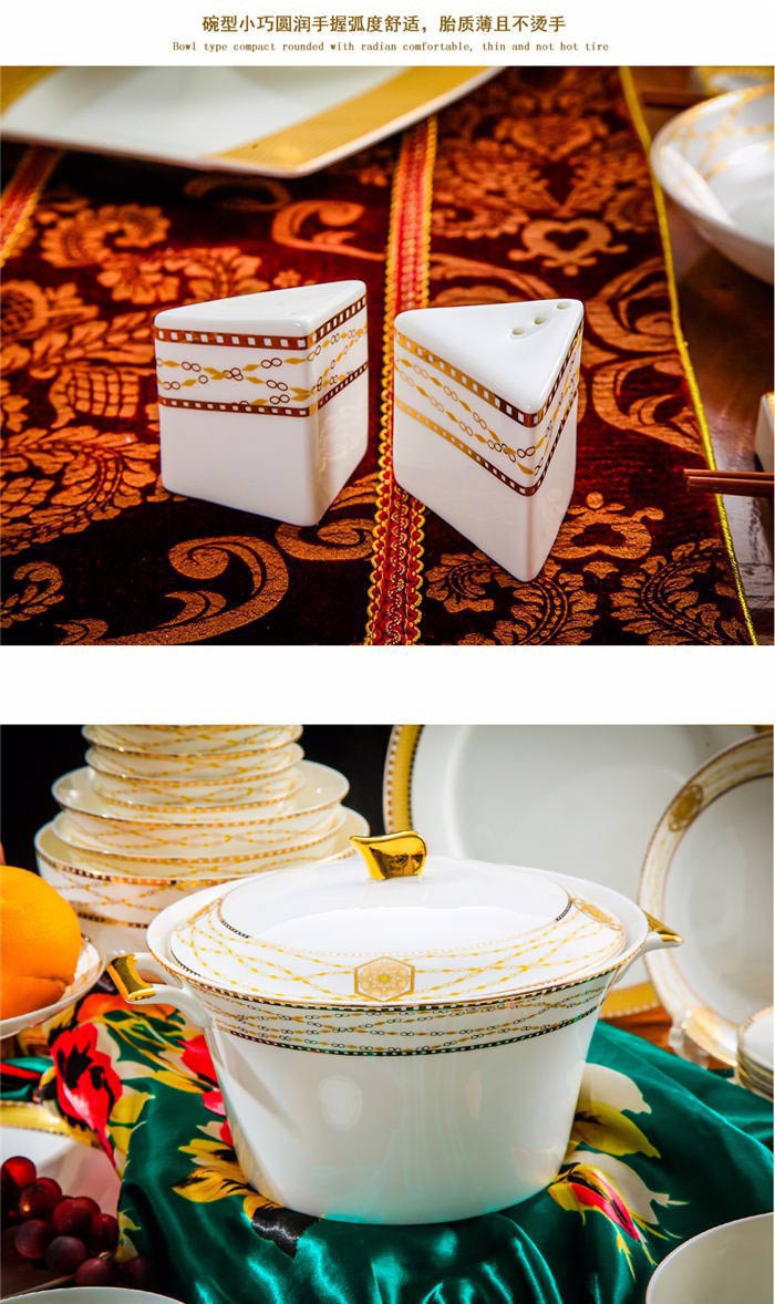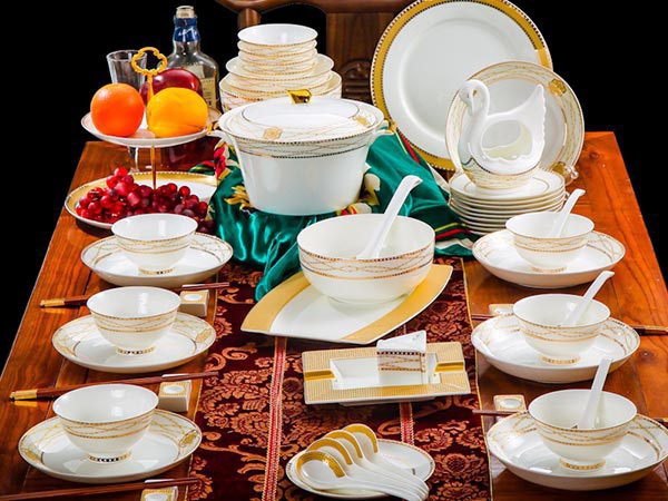 64頭金色港灣,一個(gè)湯煲,一個(gè)魚盤,一個(gè)十寸圓盤,一個(gè)飯勺,一個(gè)煙灰缸,兩個(gè)胡椒瓶,四個(gè)面碗,一個(gè)雙層水果盤,一個(gè)美鵝,十個(gè)4.5寸飯碗,十個(gè)五寸骨碟,十個(gè)八寸盤,十個(gè)調(diào)羹,十個(gè)筷子架。