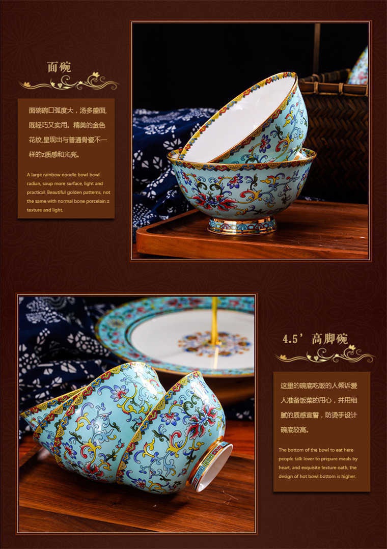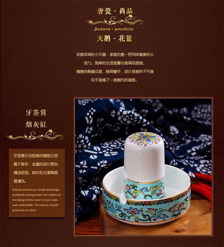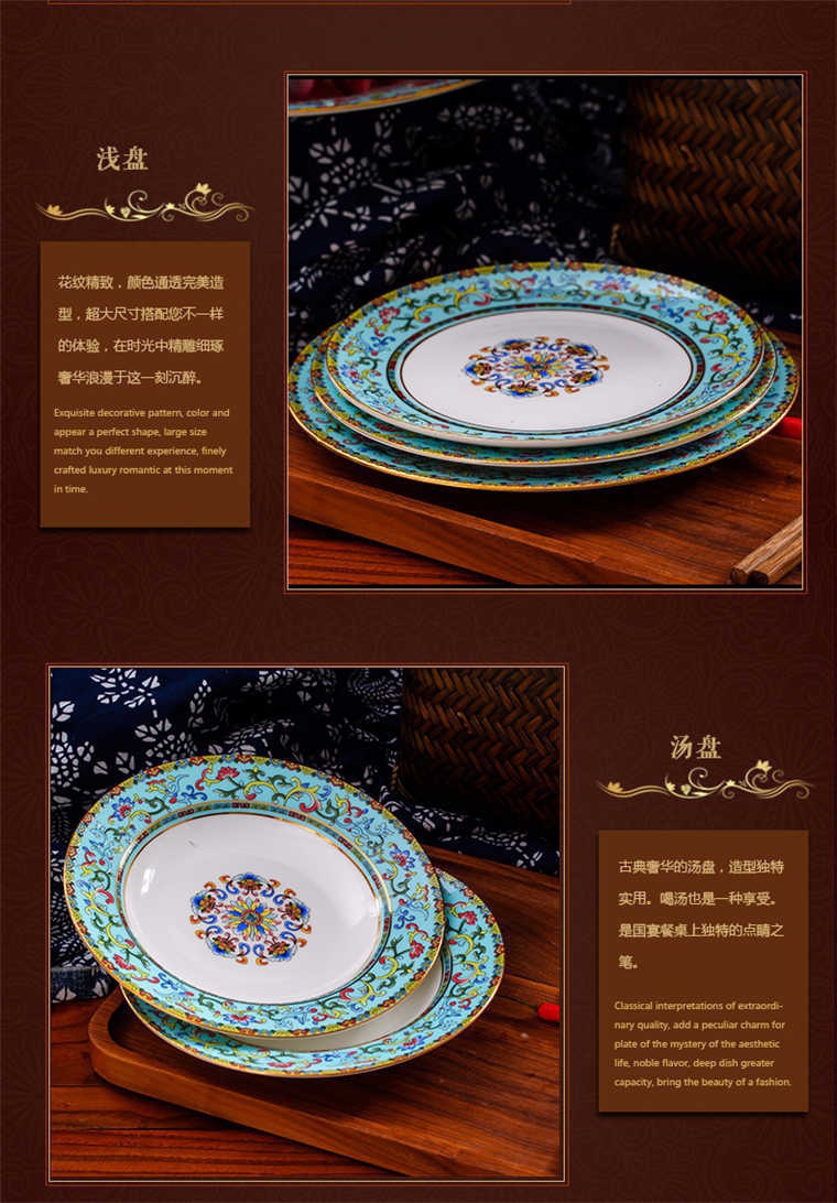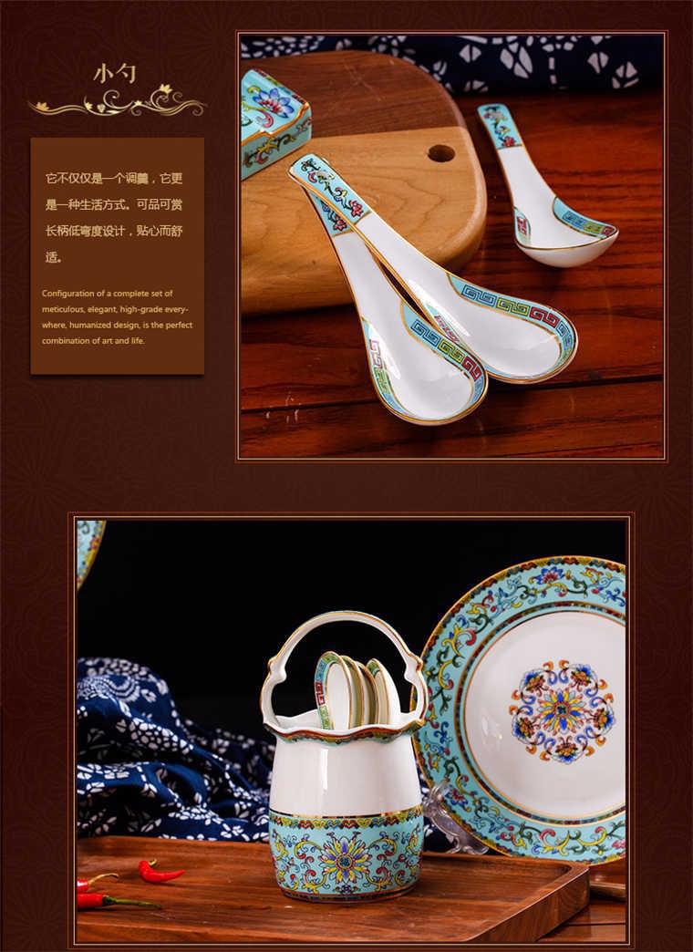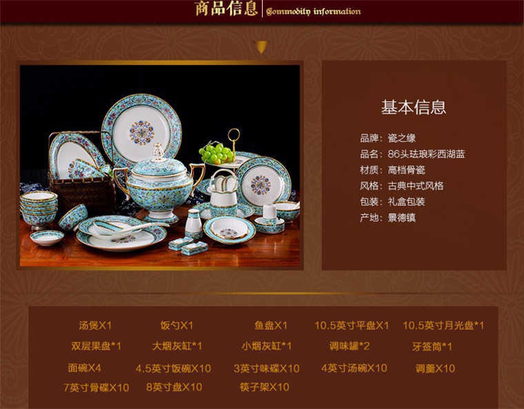 86頭琺瑯彩西湖藍,一個湯煲,一個飯勺,一個魚盤,一個10.5寸平盤,一個10.5寸月光盤,雙層果盤一個,一個大煙缸,一個小煙缸,二個調料罐,一個牙簽筒,四個面碗,十個4.5寸飯碗,十個三寸調味碟,十個4寸湯碗,十個調羹,十個7寸骨碟,十個八寸盤,十個筷子架.